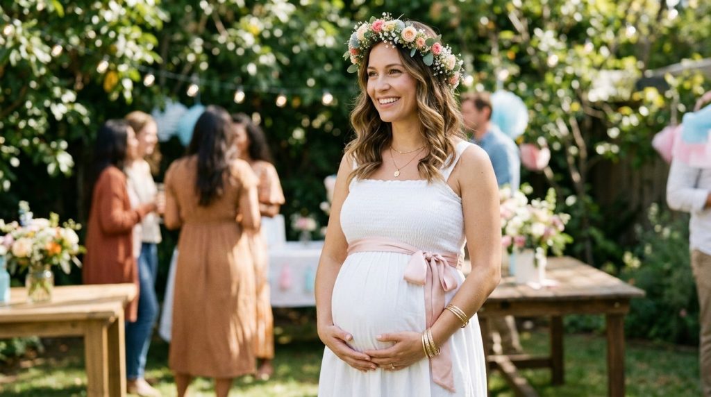 A simple satin sash reading “Mama-to-Be” or “Baby Shower Queen” can be found on Amazon or Etsy for under $10. A floral crown made from silk flowers from the dollar store costs even less and photographs beautifully. These accessories are the definition of high impact, low cost — and they work with virtually any shower outfit.